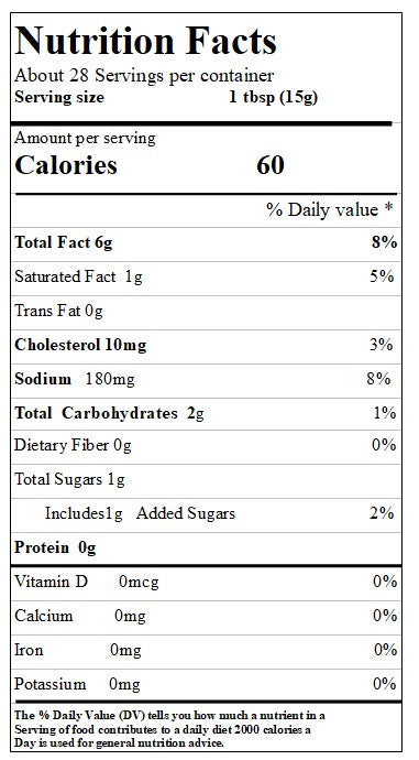 soybean oil, sriracha chili sauce ( water, red chili pepper, distilled vinegar, salt, sugar, garlic powder, xanthan gum, paprika, oleoresin, potassium sorbate added, as a preservative) water, egg yolk corn, syrup solids, distilled vinegar, sugar, salt, modified corn starch, FABA bean protein powder, mustard flour, natural flavore lemon juice concentrate, calcium disodium edta added to protect flavor.