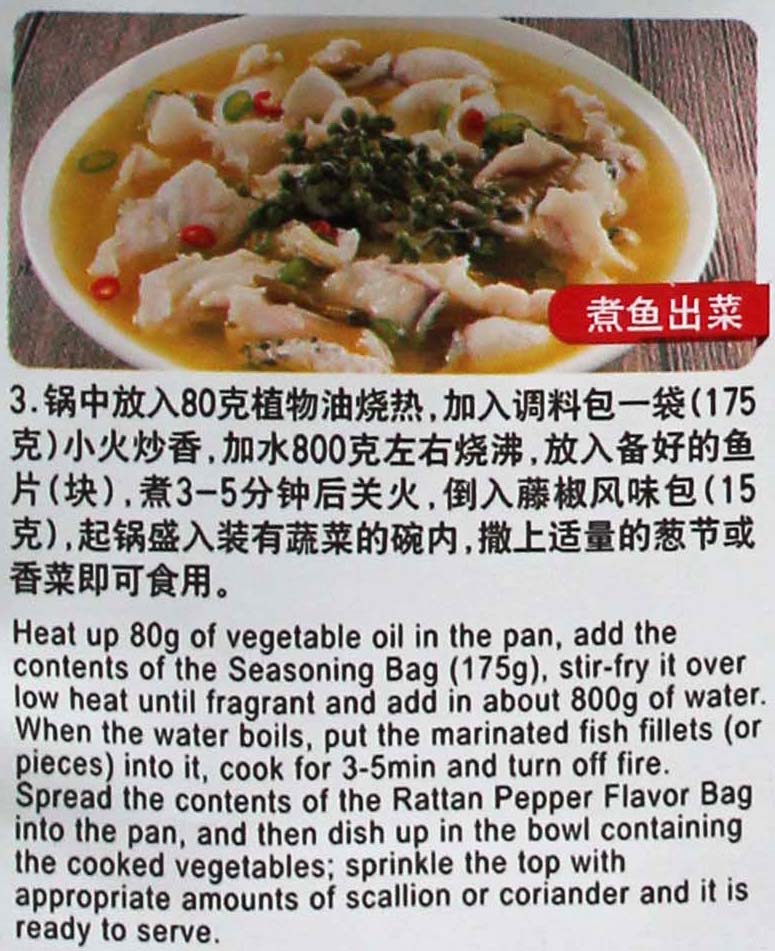 rattan pepper seasoning is one of a good choices to have quick Chinese dish in minutes. put oil into the pan, add the contents of a seasoning bag, and fry it over low heat until fragrance. add water 800 g of water when the water is boiling. put the meat into it and cook for 3 to 5 minutes. It is ready to serve
