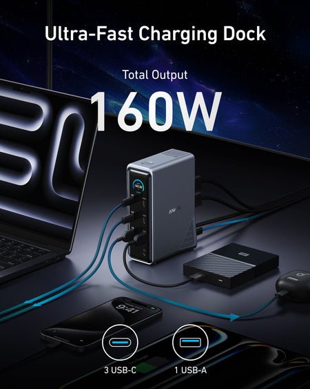 - Ultra-Fast Docking Station: Deliver a powerful charge with 160W of total output, capable of charging up to four devices simultaneously through three USB-C ports at 100W max each and one USB-A port at 12W max.