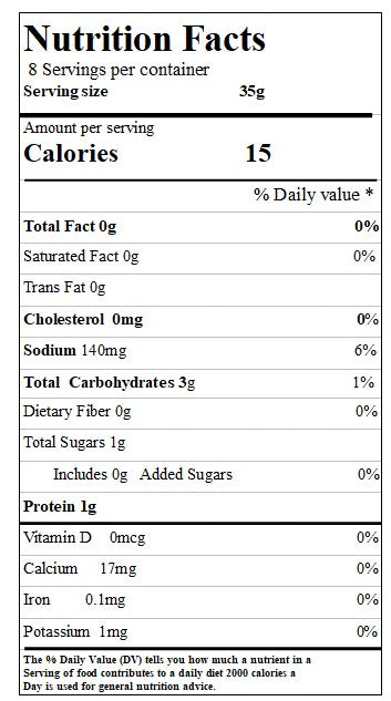 土豆、棕榈油、糖、麦芽糊精、酱油粉(酱油、盐、麦芽糊精)酱油调味粉(酱油、麦芽糊精、盐)盐、洋葱粉、水解大豆蛋白调味粉(水解大豆蛋白、麦芽糊精、盐、葡萄糖)鲣鱼调味粉(鲣鱼、盐、麦芽糊精、玉米淀粉、糖、葡萄糖、酵母提取物、酱油、甘氨酸、二氧化硅、抗氧化剂(柠檬酸)DL-苹果酸、卵磷脂、调味剂(5'-肌苷酸钠、5'-鸟苷酸钠)抗氧化剂(维生素E)酵母提取物、海藻粉、棕榈油、柠檬酸、二氧化硅、调味剂(5'-肌苷酸钠、5'-鸟苷酸钠)甜味剂(阿斯巴甜)不适合苯丙酮尿症患者