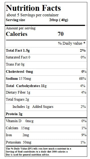 酱油(水、盐、大豆、小麦粉)豆豉(黑豆、盐、水)糖、水、盐、脱水大蒜、咸辣椒(辣椒、盐)生姜、大豆油、鱼提取物(凤尾鱼、盐)米酒(水、米、小麦)改性玉米淀粉。