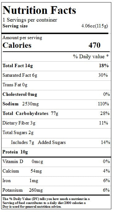 强化小麦粉、棕榈油、马铃薯淀粉、改性马铃薯淀粉、盐、小麦面筋、乳化油(葵花籽油、卵磷脂)、洋葱提取物、蔬菜提取物(大蒜、洋葱)碱剂(碳酸钾、碳酸钠、磷酸钠)瓜尔胶、菜籽油汤底:调味料(酱油、盐、米粉、大蒜、洋葱、酵母提取物、麦芽糊精、葡萄糖、玉米糖浆、味精)盐、辣味调味料(麦芽糊精、葡萄糖、小麦、红辣椒、辣椒)酱油粉(大豆、小麦、盐)糖、红辣椒粉、大蒜粉、黑胡椒粉、人造鸡肉香精、核苷酸钠、姜粉、蒜味油)大蒜浓缩物、菜籽油)辣椒粉:干葱、干胡萝卜、干大蒜、干蘑菇、干红辣椒