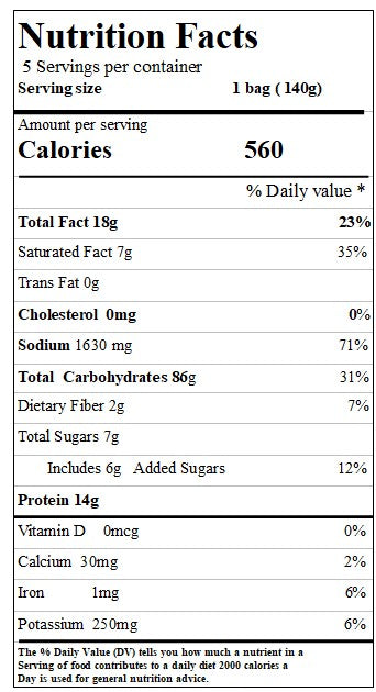 酱包:水 人造鸡肉味精粉(人造香料、糊精、小麦淀粉、糖、盐、酵母提取物、天然香料、5'核糖核苷酸二钠、麦芽糊精、玉米淀粉) 酱油调味料(大豆、水、盐、小麦、碳酸钠、高果糖玉米糖浆、5'核糖核苷酸二钠、大蒜、甜菊糖苷、麦芽糊精、糖) 糖、辣椒调味料(红辣椒、糊精、盐、糖、洋葱粉、人造香料、大蒜粉、二氧化硅、酱油(水、大豆、小麦、盐) 辣椒油树脂、辣椒粉树脂、味精、肌苷酸二钠、鸟苷酸二钠) 大豆油、洋葱、红辣椒籽油、少于 2% 的:大蒜、食品改性淀粉、辣椒油树脂、辣椒粉油树脂、黑胡椒粉、天然和人工咖喱香料(小茴香、盐、麦芽糊精、人工香料)。