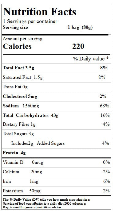 汤底包(6.5%)盐,增味剂:味精(621)鸟苷酸二钠(e627),肌苷酸二钠(e631):糖,干菜(葱,香菜),组织小麦面筋,胡椒,辣椒,人工蟹味精,抗结剂:二氧化硅(e51)